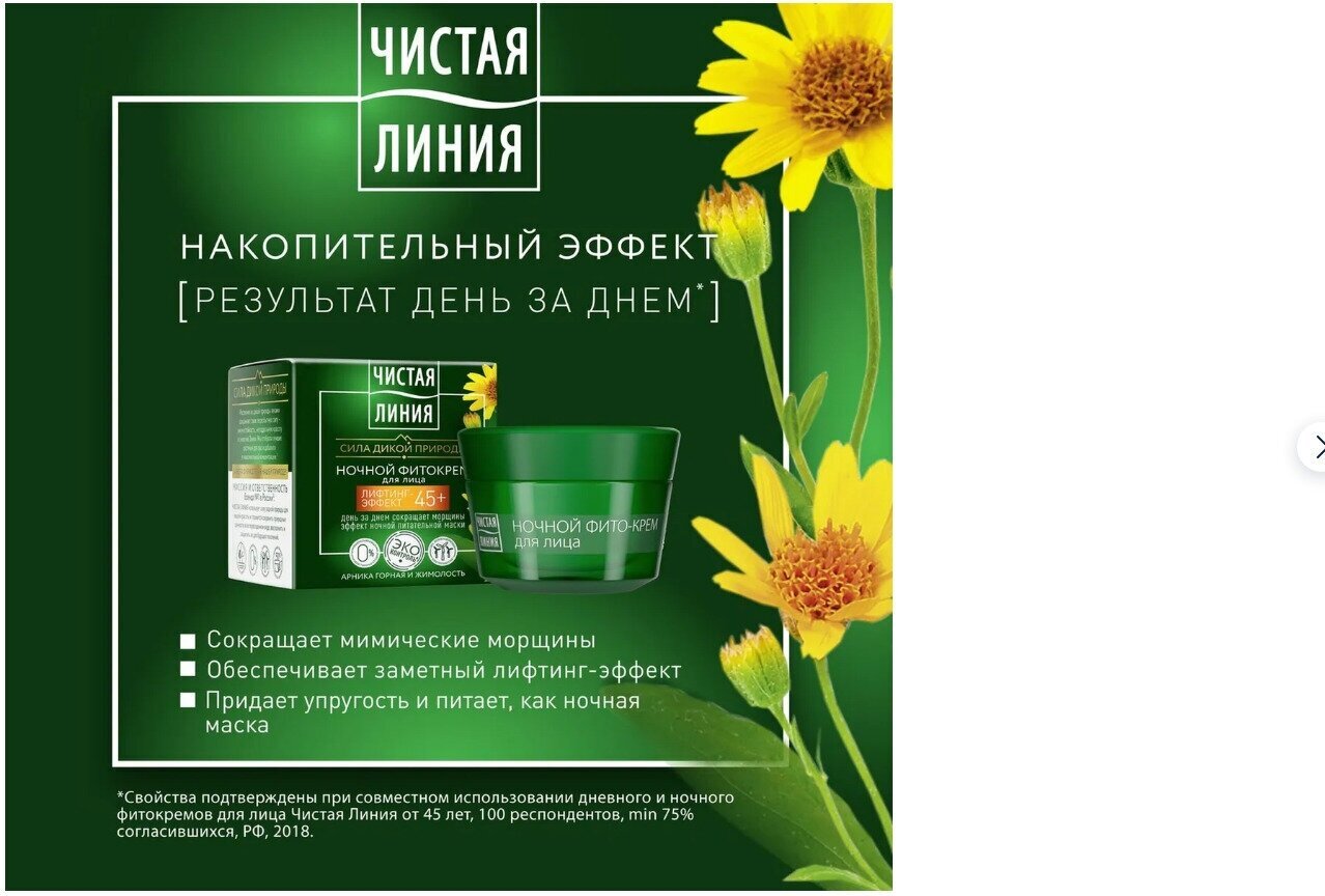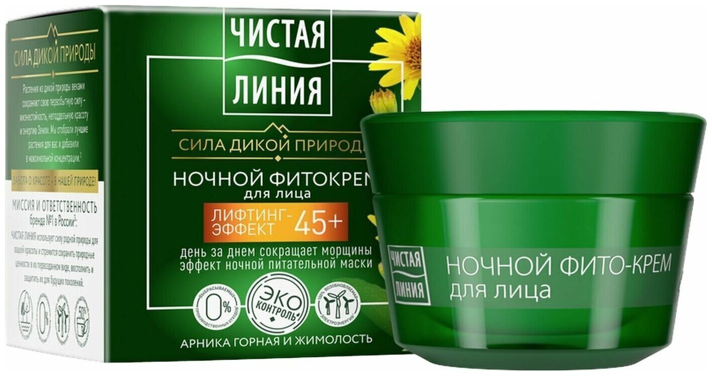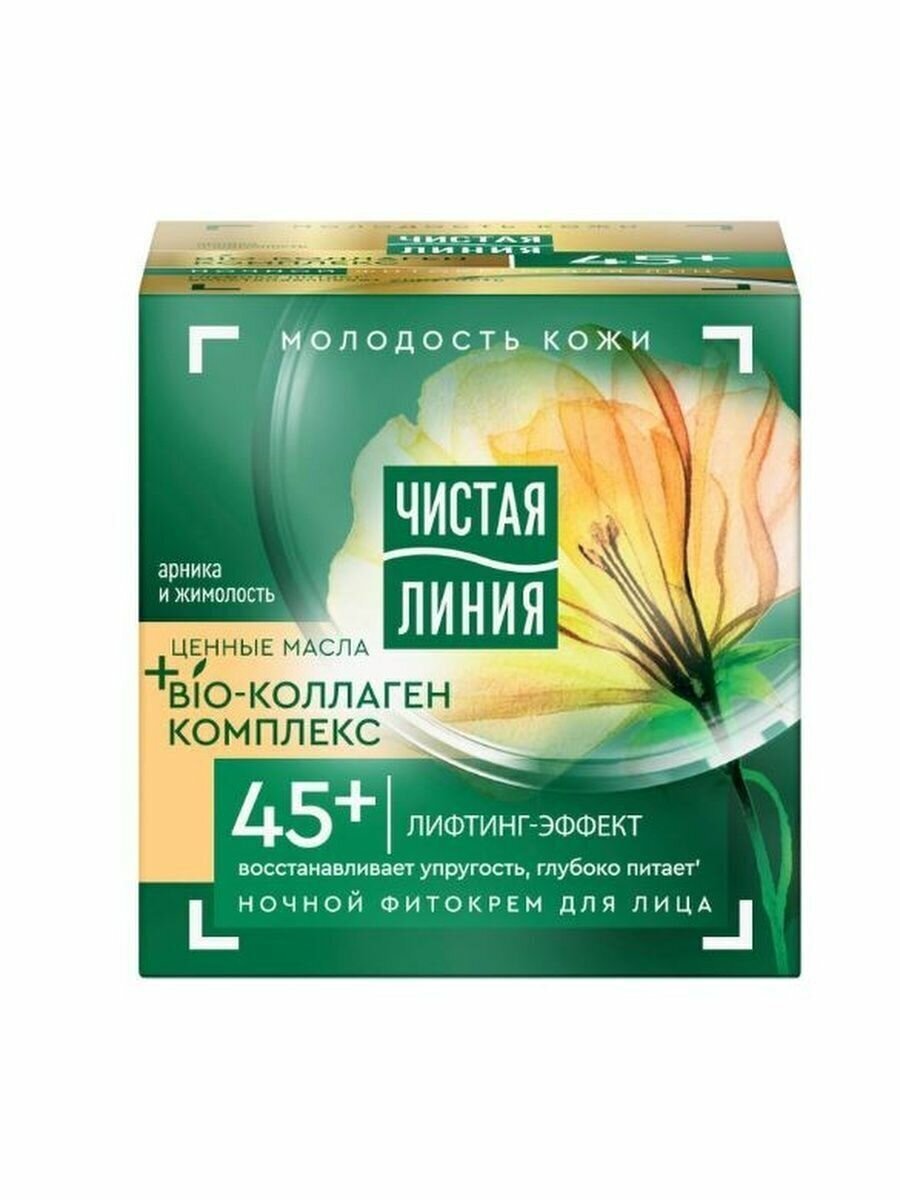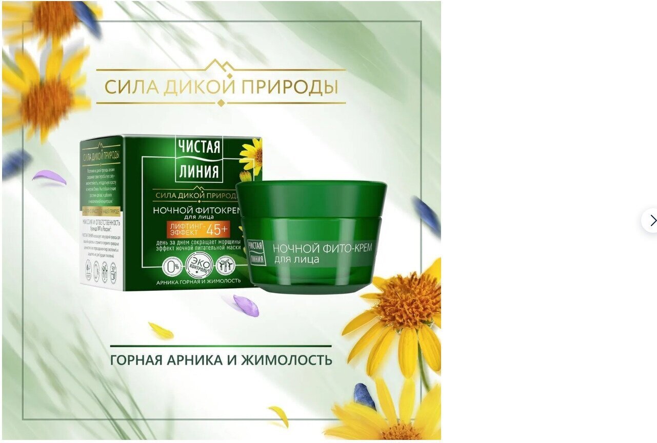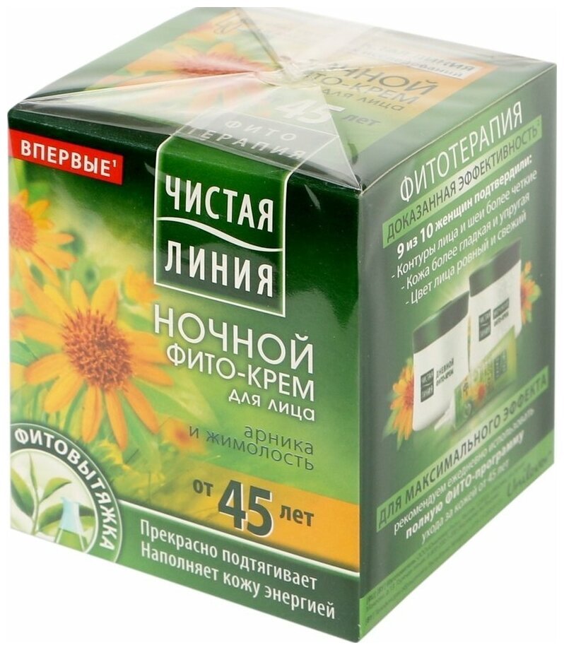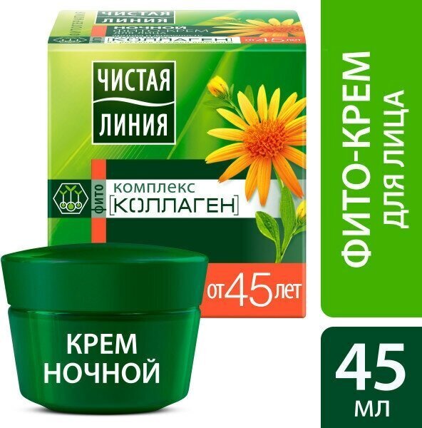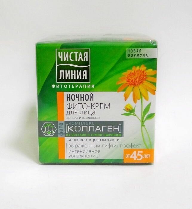 впервые Кремы Чистая Линия обогащены комплексом [фитоколлаген] из ростков и семян пшеницы. УЖЕ С первого применения* проникая в кожу, комплекс [фитоколлаген] наполняет и разглаживает ее. УЖЕ через 16 дней восстанавливает контуры лица. Посмотри, КАК меняется лицо женщины С возрастом! Ночной крем с [фитоколлаген]-комплексом, арникой и жимолостью “Фито-линия от 45 лет” эффективно насыщает влагой и питает кожу в ночное время. Активные компоненты [фитоколлаген]-комплекса способствуют омоложению кожи: кожа разглаживается и наполняется энергией, цвет лица выглядит свежим, контуры шеи и лица становятся более четкими. Узнай больше О всей линейке антивозрастных средств! В составе крема отмечены растительные компоненты, содержащие витамины, минералы и антиоксиданты.