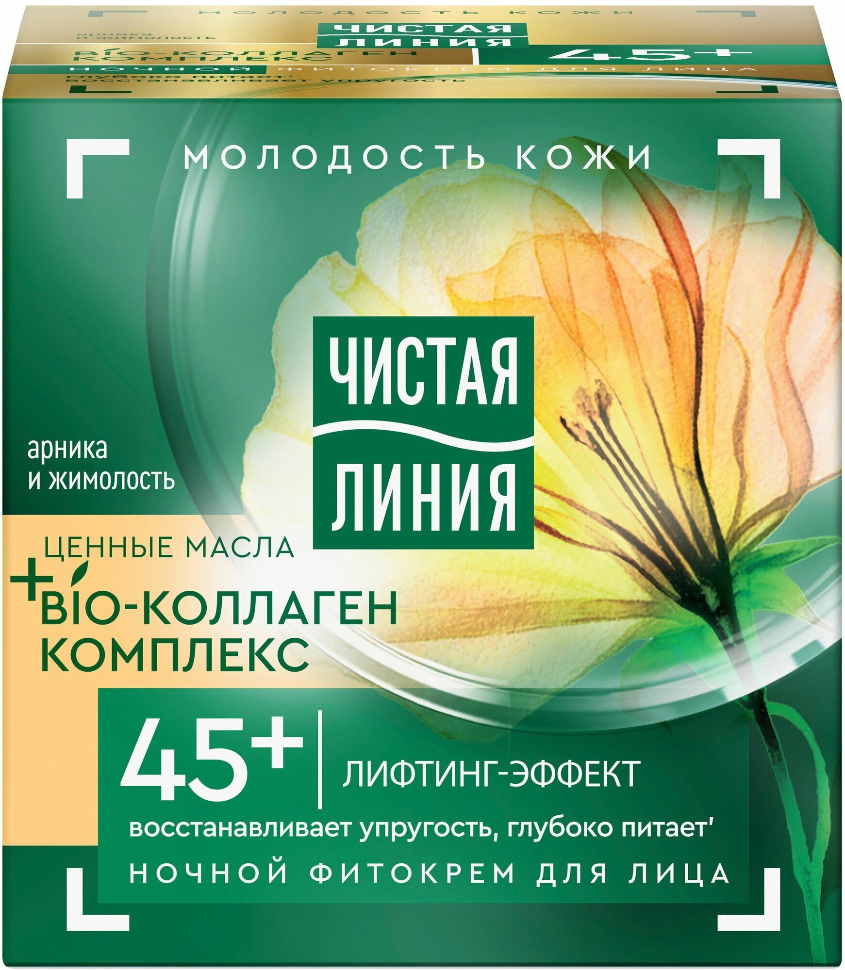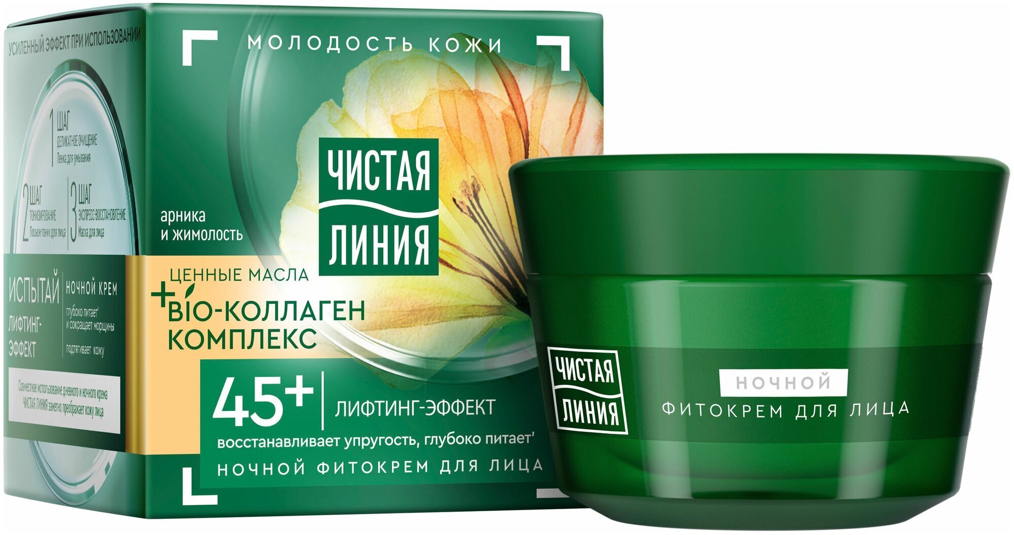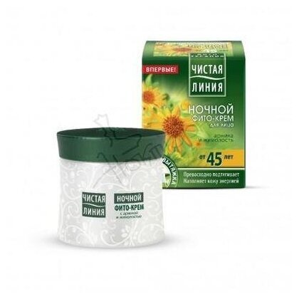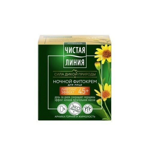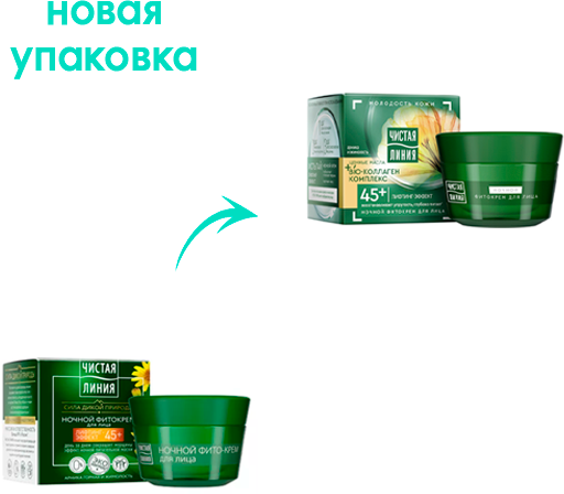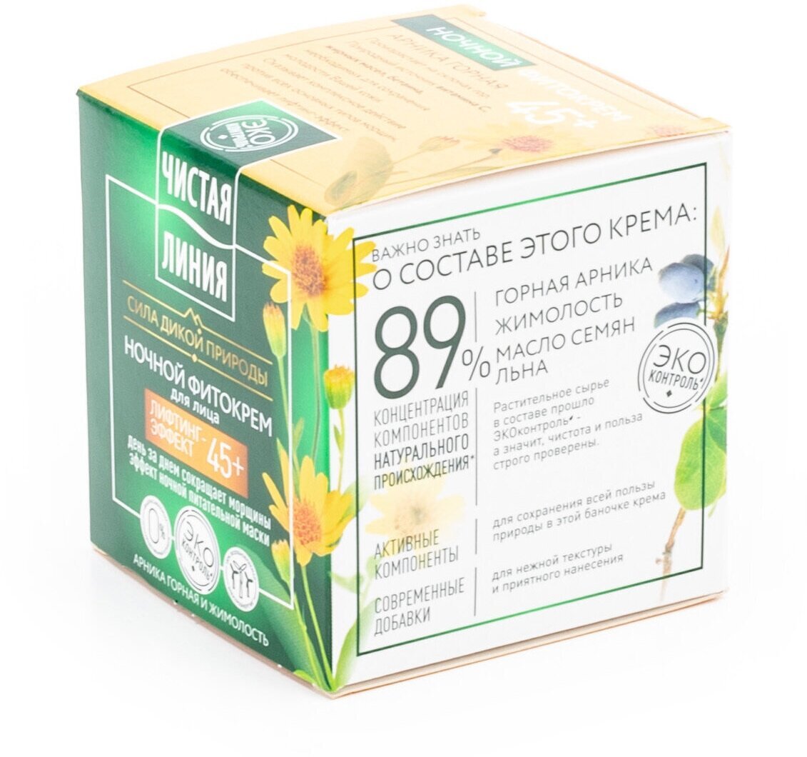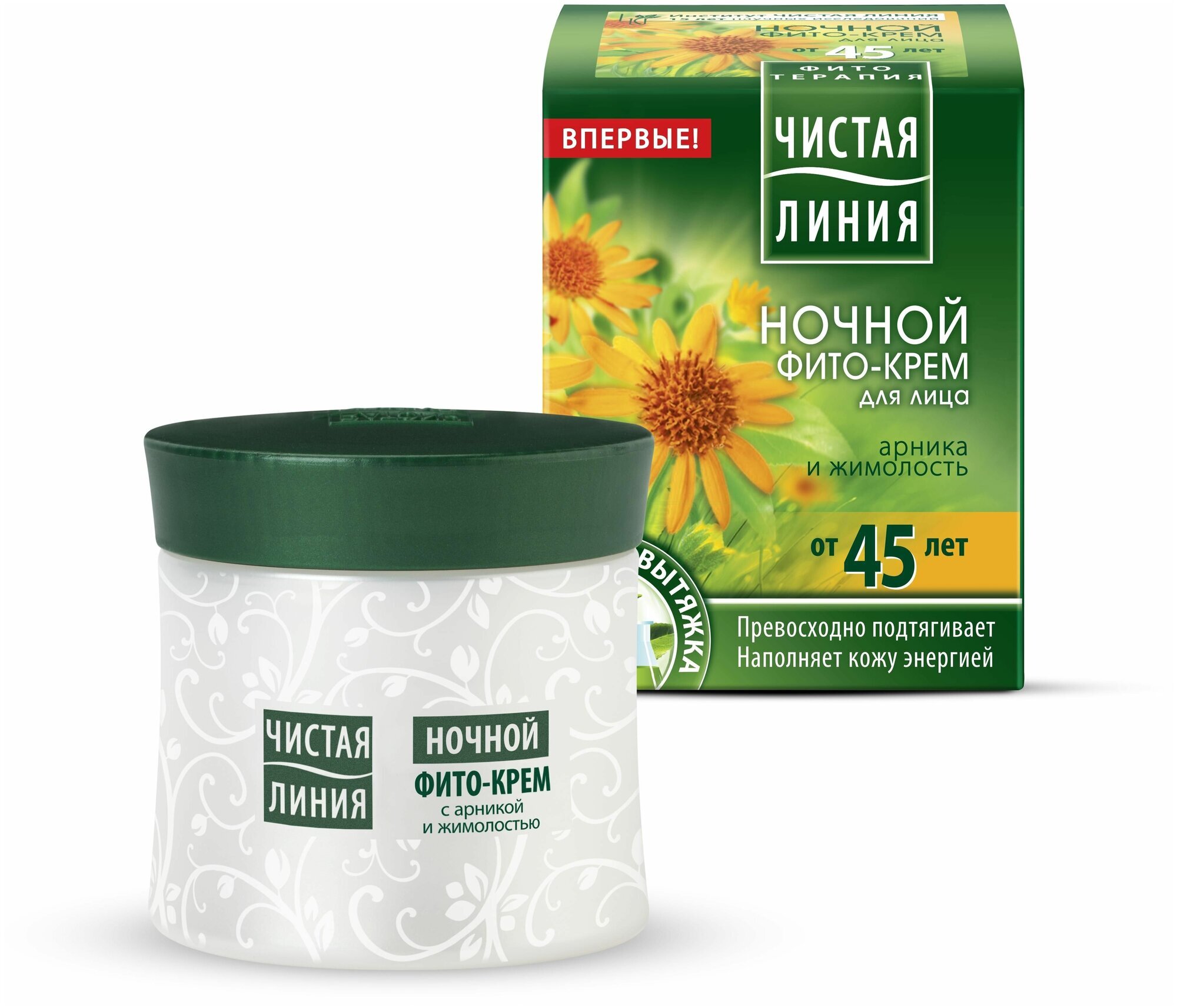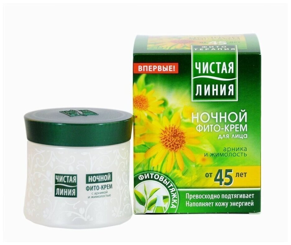 впервые Кремы Чистая Линия обогащены комплексом [фитоколлаген] из ростков и семян пшеницы. УЖЕ С первого применения* проникая в кожу, комплекс [фитоколлаген] наполняет и разглаживает ее. УЖЕ через 16 дней восстанавливает контуры лица. Посмотри, КАК меняется лицо женщины С возрастом! Ночной крем с [фитоколлаген]-комплексом, арникой и жимолостью “Фито-линия от 45 лет” эффективно насыщает влагой и питает кожу в ночное время. Активные компоненты [фитоколлаген]-комплекса способствуют омоложению кожи: кожа разглаживается и наполняется энергией, цвет лица выглядит свежим, контуры шеи и лица становятся более четкими. Узнай больше О всей линейке антивозрастных средств! В составе крема отмечены растительные компоненты, содержащие витамины, минералы и антиоксиданты.