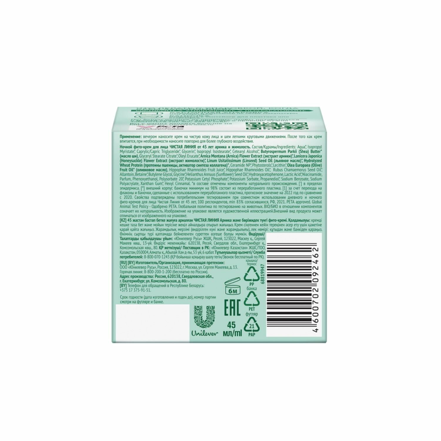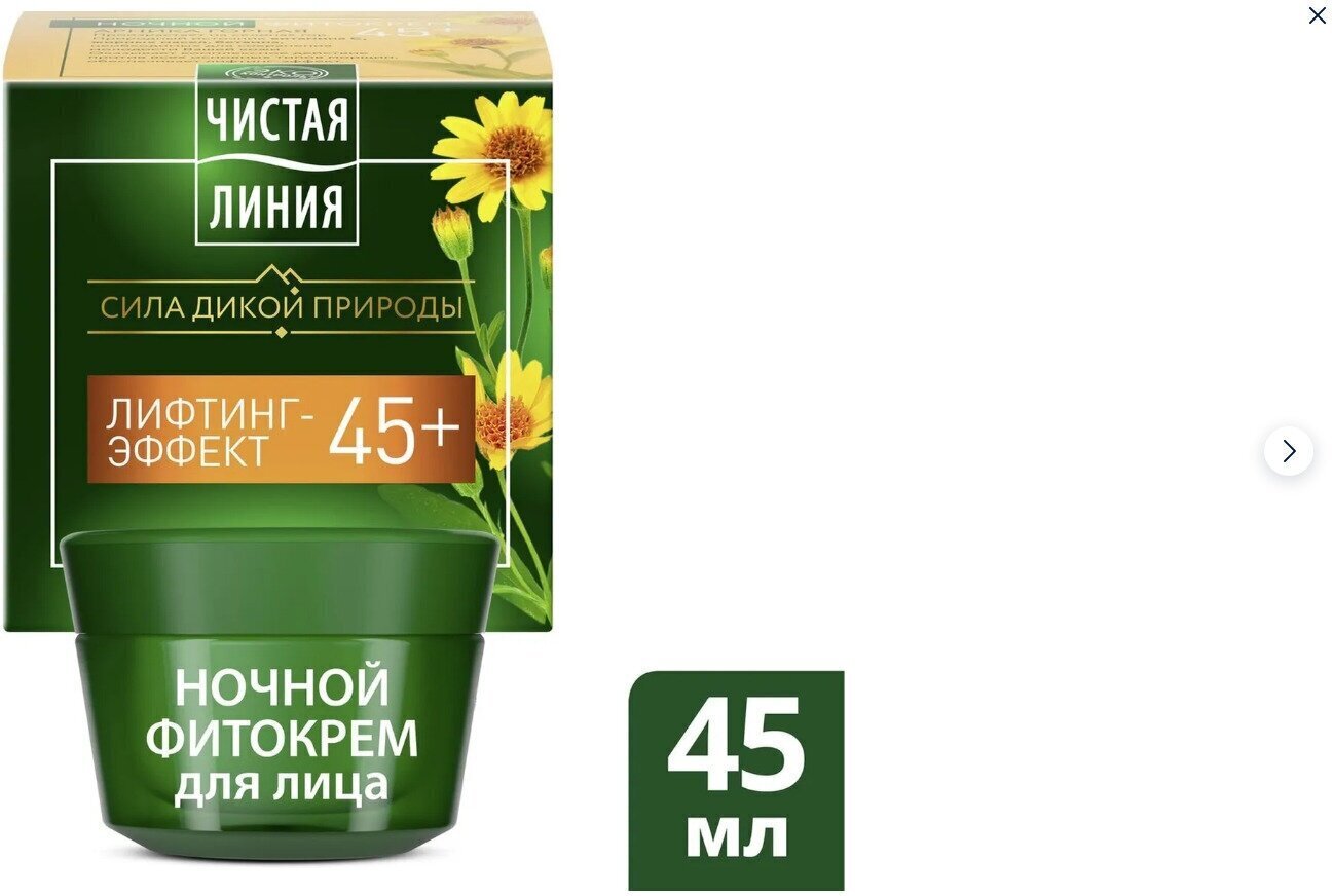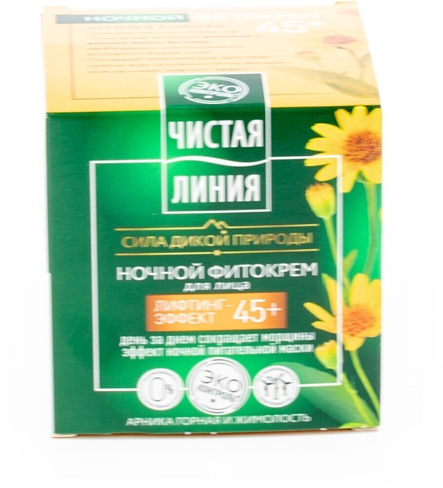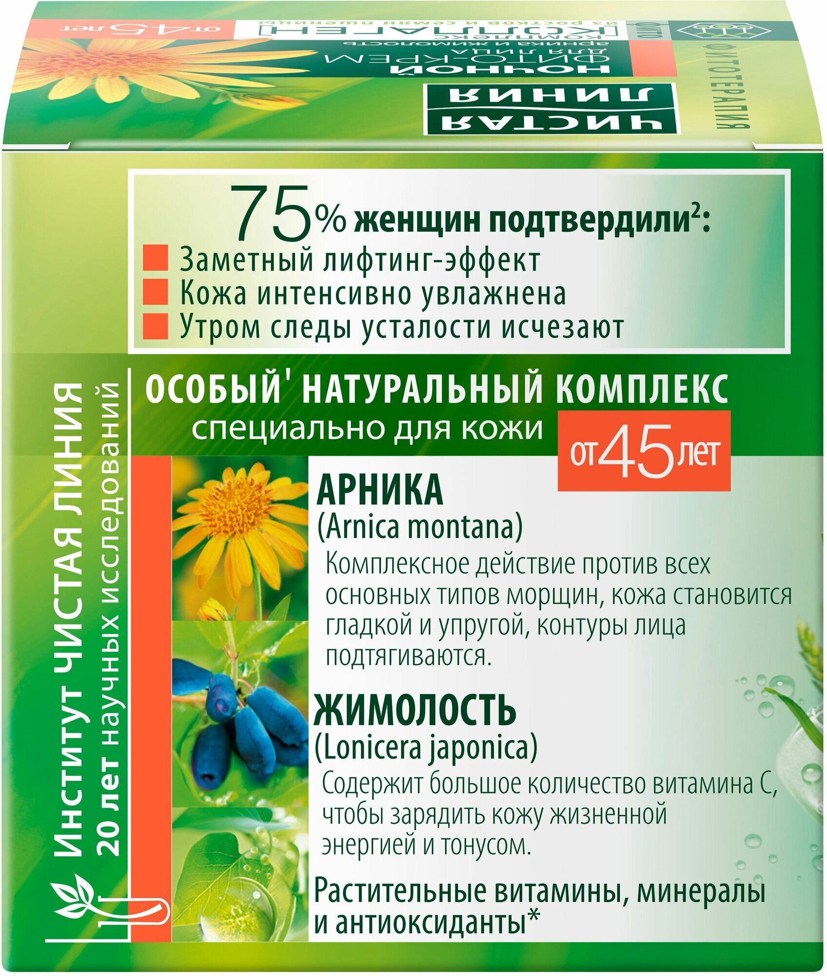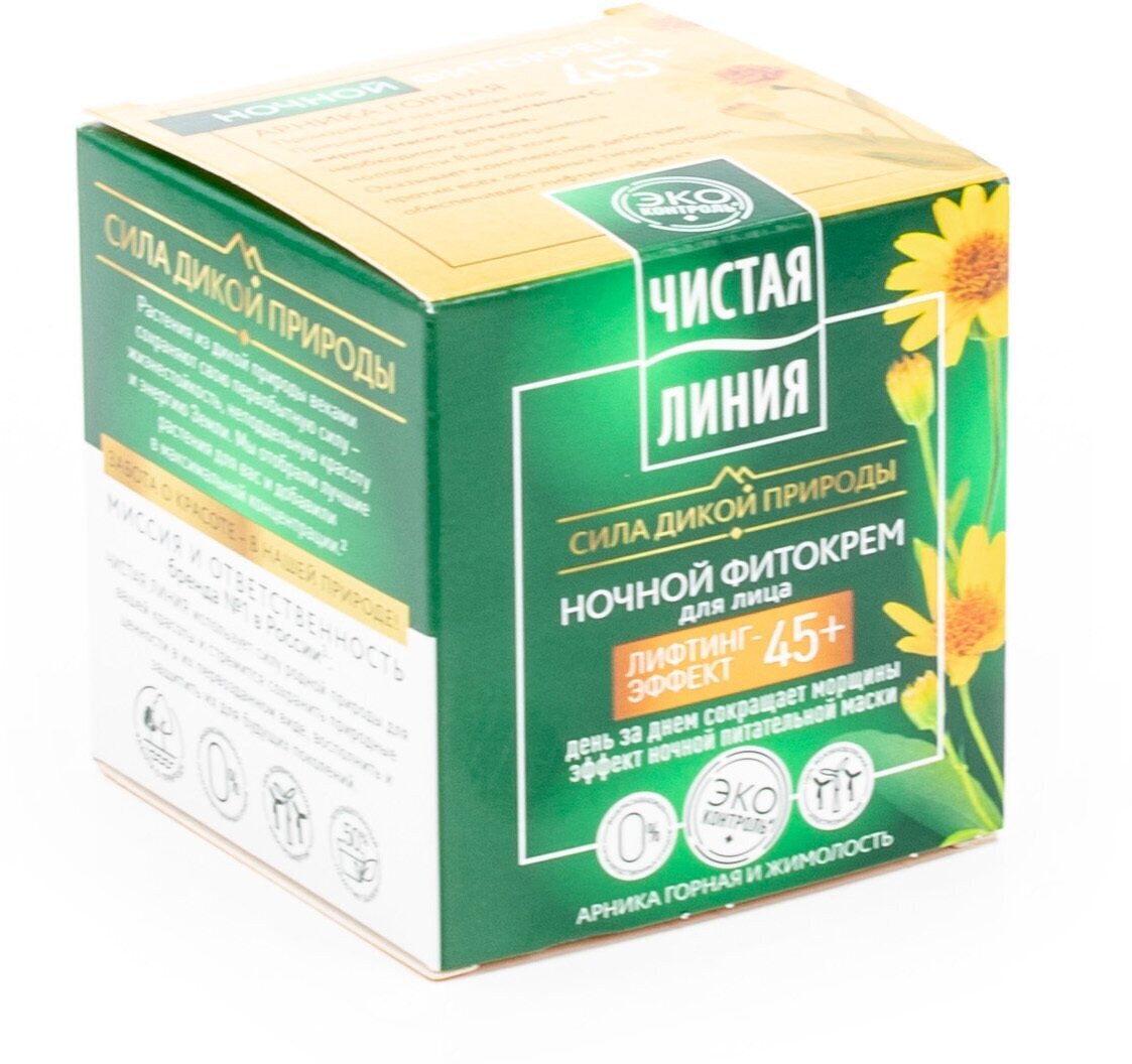 впервые Кремы Чистая Линия обогащены комплексом [фитоколлаген] из ростков и семян пшеницы. УЖЕ С первого применения* проникая в кожу, комплекс [фитоколлаген] наполняет и разглаживает ее. УЖЕ через 16 дней восстанавливает контуры лица. Посмотри, КАК меняется лицо женщины С возрастом! Ночной крем с [фитоколлаген]-комплексом, арникой и жимолостью “Фито-линия от 45 лет” эффективно насыщает влагой и питает кожу в ночное время. Активные компоненты [фитоколлаген]-комплекса способствуют омоложению кожи: кожа разглаживается и наполняется энергией, цвет лица выглядит свежим, контуры шеи и лица становятся более четкими. Узнай больше О всей линейке антивозрастных средств! В составе крема отмечены растительные компоненты, содержащие витамины, минералы и антиоксиданты.