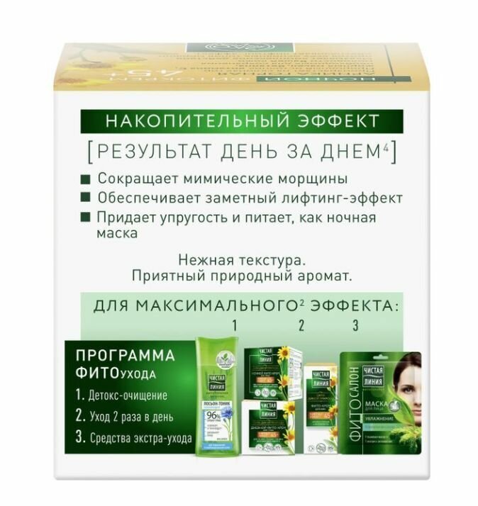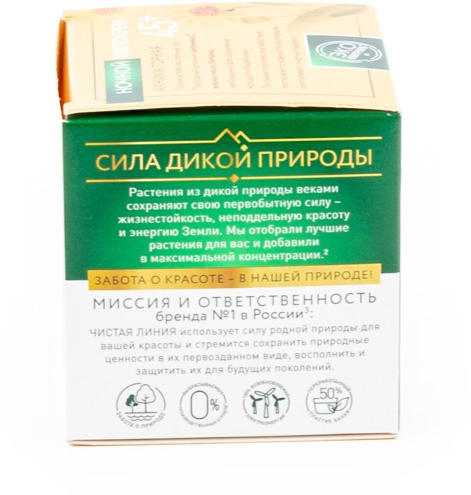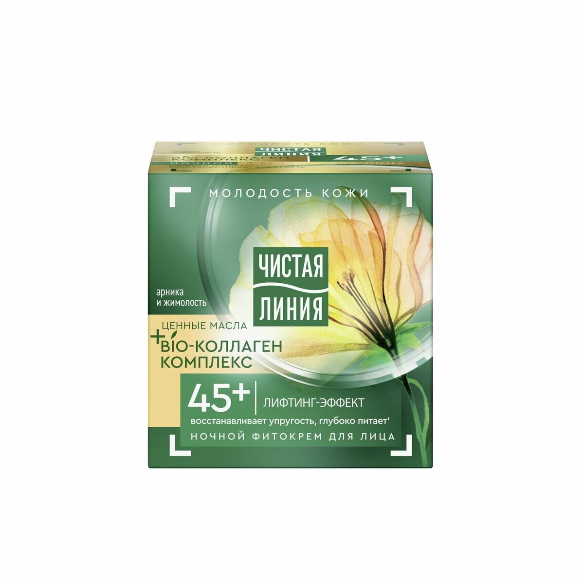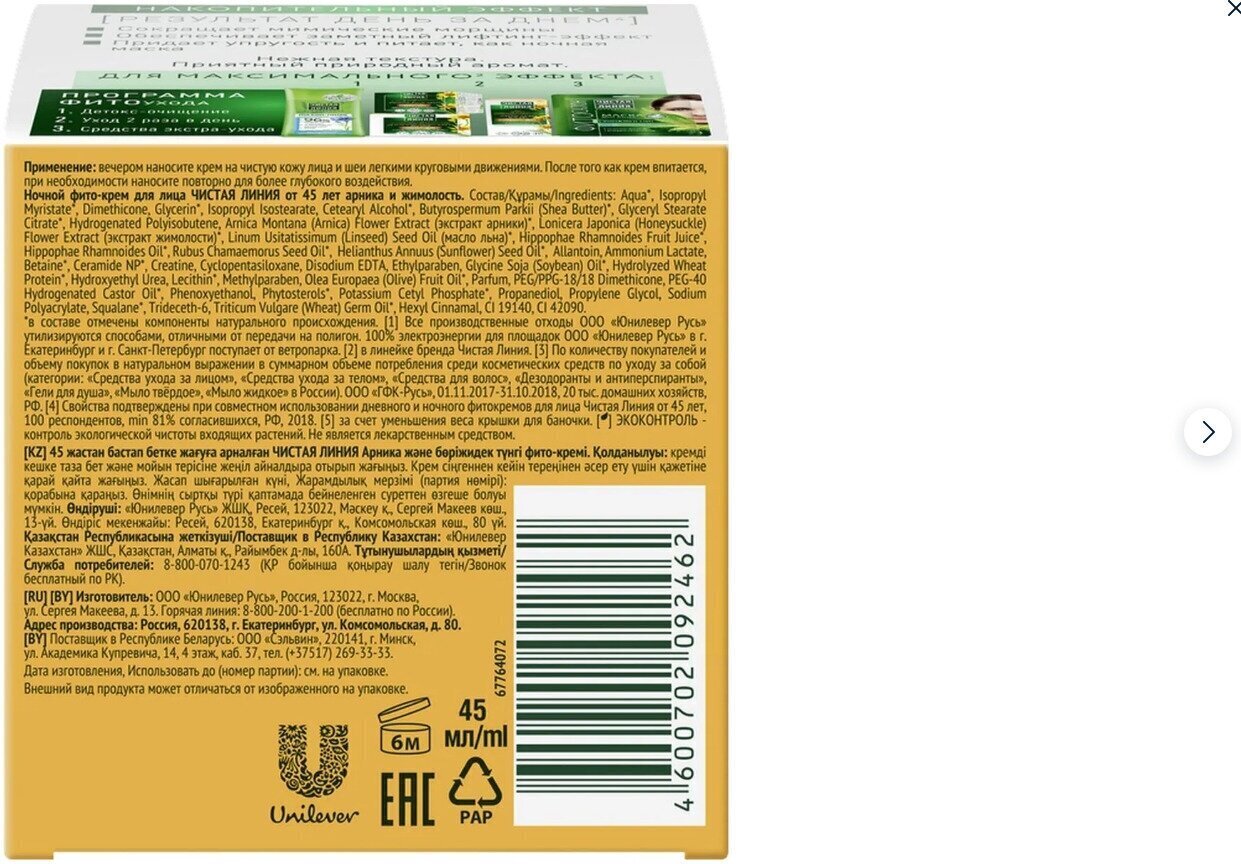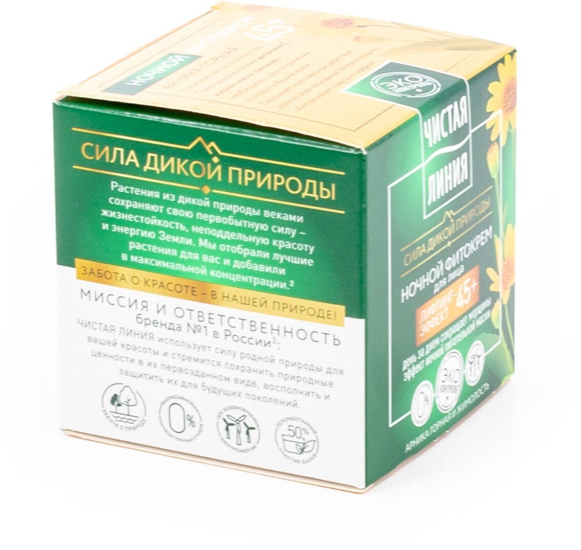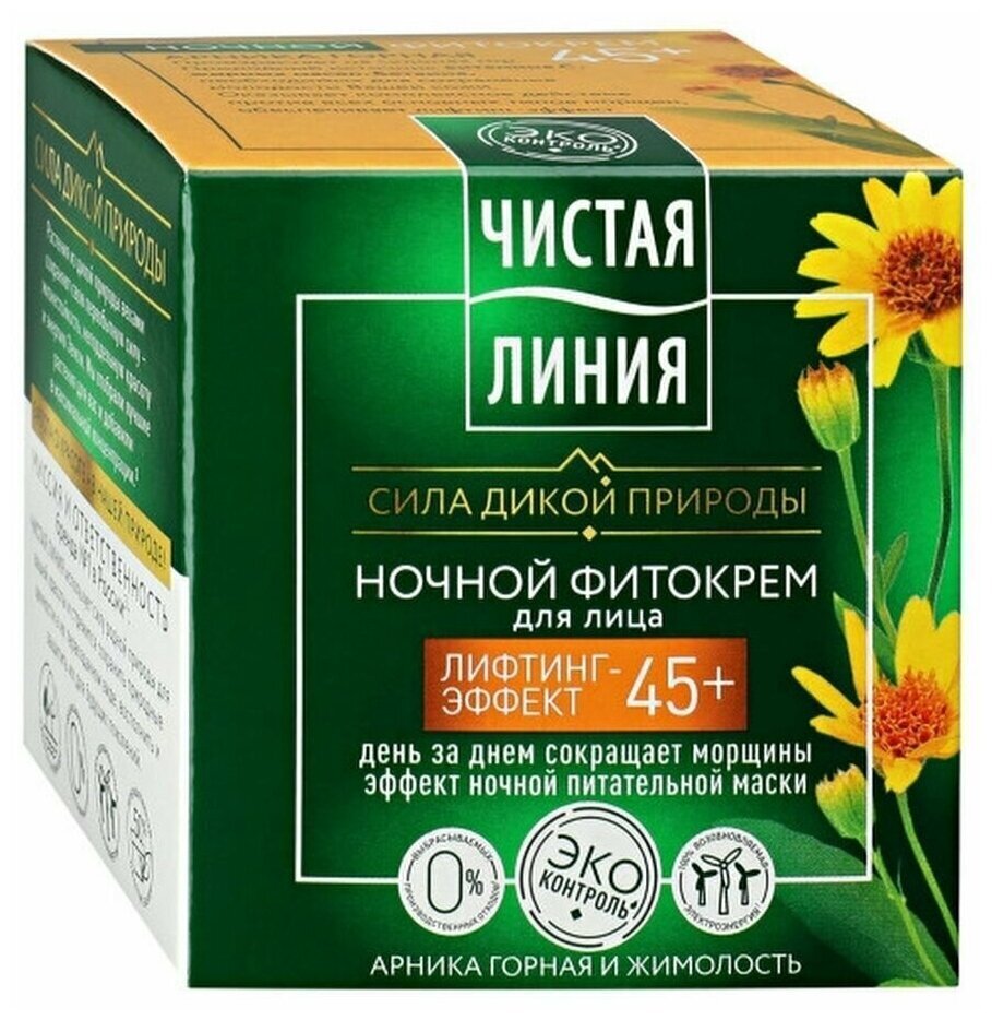 впервые Кремы Чистая Линия обогащены комплексом [фитоколлаген] из ростков и семян пшеницы. УЖЕ С первого применения* проникая в кожу, комплекс [фитоколлаген] наполняет и разглаживает ее. УЖЕ через 16 дней восстанавливает контуры лица. Посмотри, КАК меняется лицо женщины С возрастом! Ночной крем с [фитоколлаген]-комплексом, арникой и жимолостью “Фито-линия от 45 лет” эффективно насыщает влагой и питает кожу в ночное время. Активные компоненты [фитоколлаген]-комплекса способствуют омоложению кожи: кожа разглаживается и наполняется энергией, цвет лица выглядит свежим, контуры шеи и лица становятся более четкими. Узнай больше О всей линейке антивозрастных средств! В составе крема отмечены растительные компоненты, содержащие витамины, минералы и антиоксиданты.