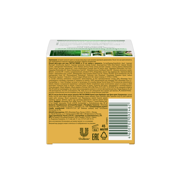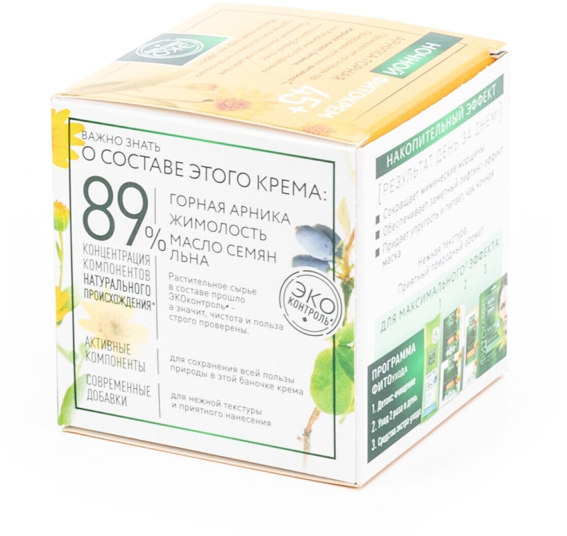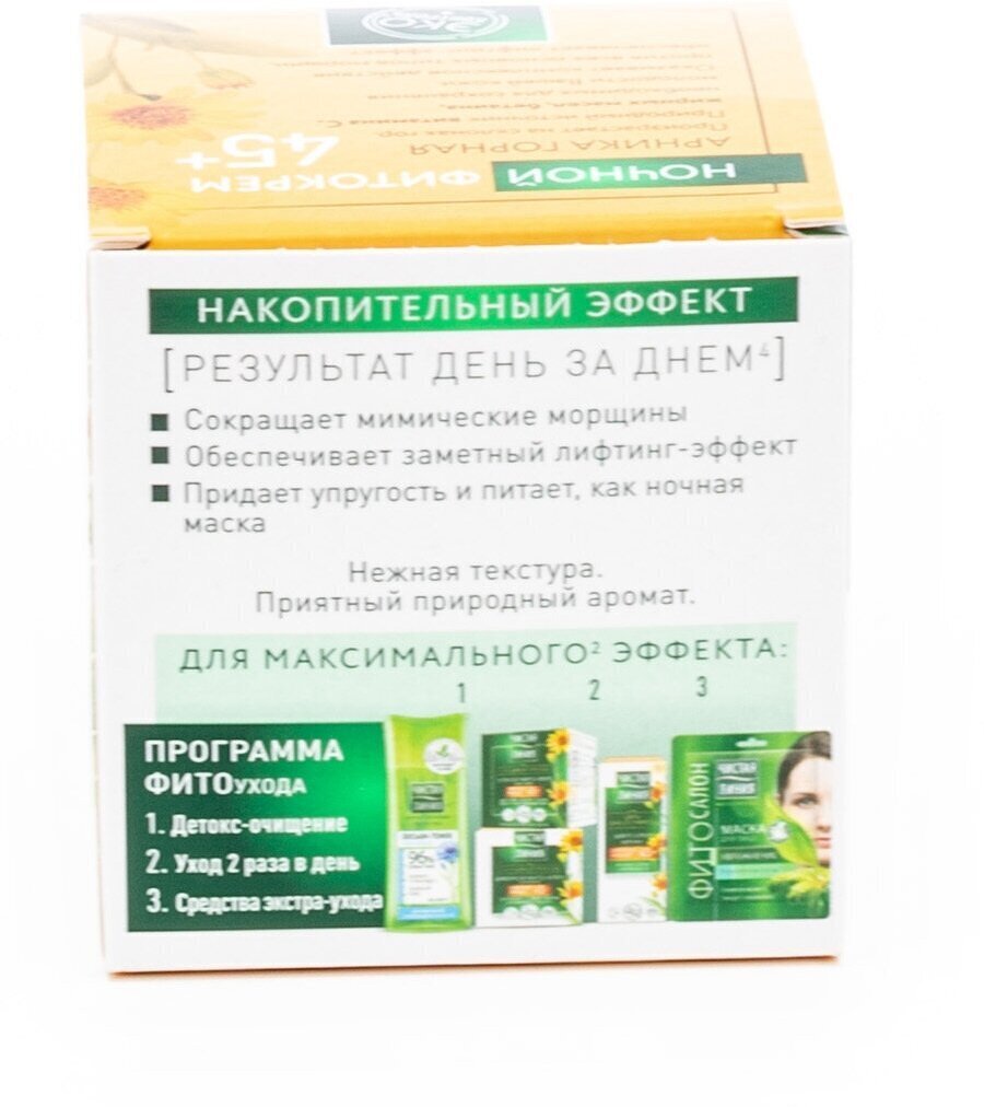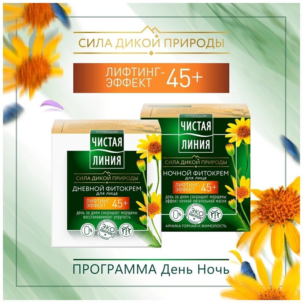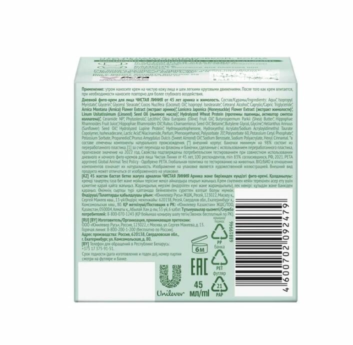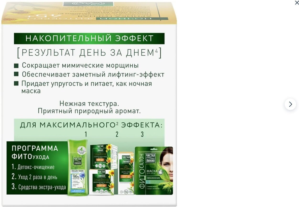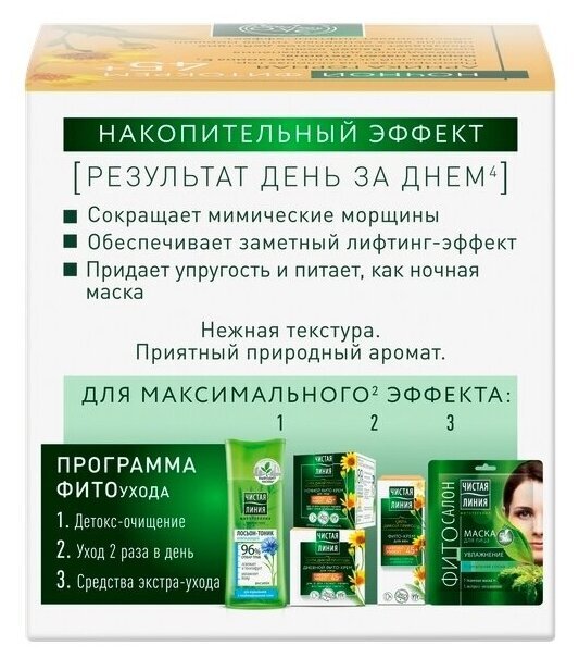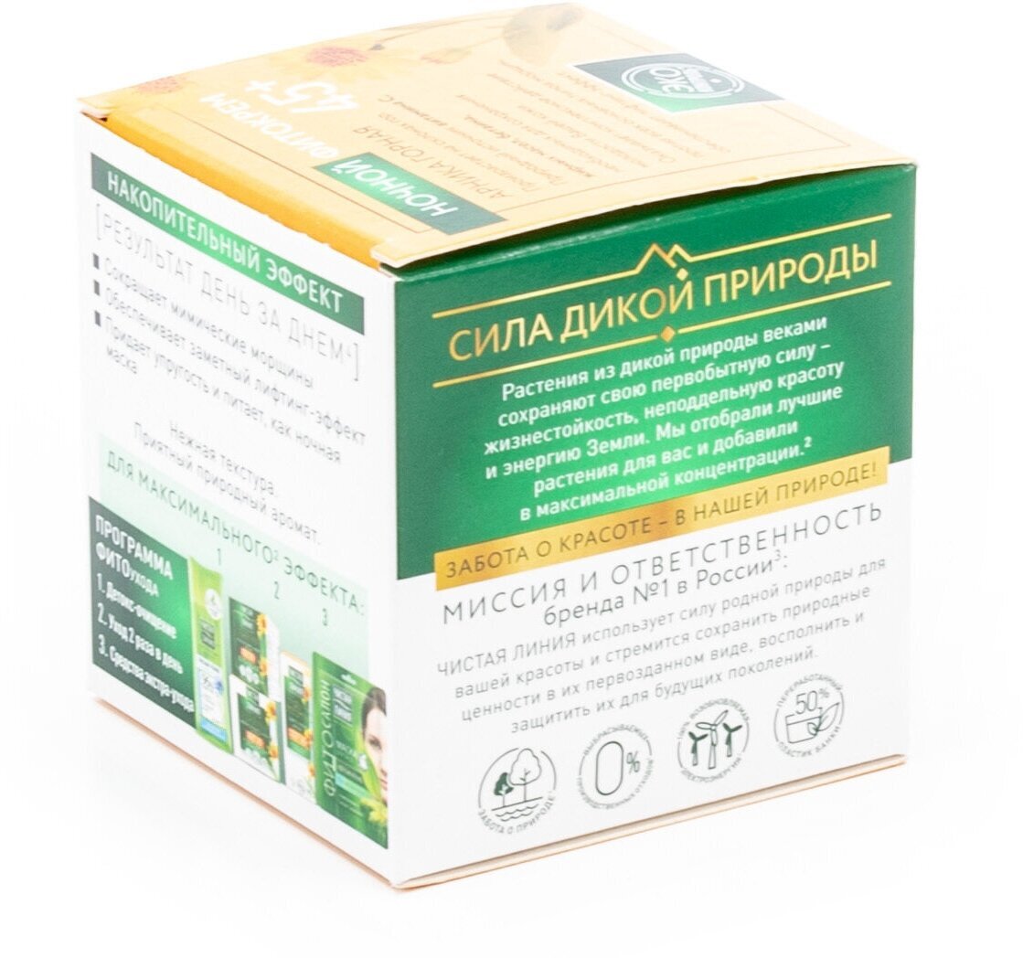 впервые Кремы Чистая Линия обогащены комплексом [фитоколлаген] из ростков и семян пшеницы. УЖЕ С первого применения* проникая в кожу, комплекс [фитоколлаген] наполняет и разглаживает ее. УЖЕ через 16 дней восстанавливает контуры лица. Посмотри, КАК меняется лицо женщины С возрастом! Ночной крем с [фитоколлаген]-комплексом, арникой и жимолостью “Фито-линия от 45 лет” эффективно насыщает влагой и питает кожу в ночное время. Активные компоненты [фитоколлаген]-комплекса способствуют омоложению кожи: кожа разглаживается и наполняется энергией, цвет лица выглядит свежим, контуры шеи и лица становятся более четкими. Узнай больше О всей линейке антивозрастных средств! В составе крема отмечены растительные компоненты, содержащие витамины, минералы и антиоксиданты.